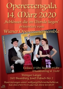 "Operette aus Wien" Das Wiener Operettenensemble 2020 Im Jahr 2018 und 2019 war das Wiener Operettenensemble mit sehr großem Erfolg auf Tournee in Norddeutschland. 2020 gastiert dieses hochkarätige Ensemble am 14. März 2020 im Weingut Langes in Bisamberg und wird einen berührenden Abend voller Leidenschaft und Lebensfreude mit Top-Hits, schwungvollen Tanznummern und Gustostückerln aus Operette und Wienerlied präsentieren. Die musikalische Reise geht zu Evergreens von Komponisten-Stars wie Emmerich Kálmán, Johann Strauß, Franz Lehár, Paul Abraham und Hermann Leopoldi mit ihrer zeitlosen…